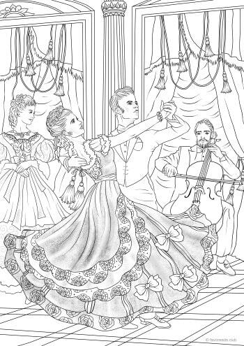 this one, on the other hand, is much better! not only is there wonderful detail on the characters, but there is a complex background to color and the details are not too small that they can't be colored.